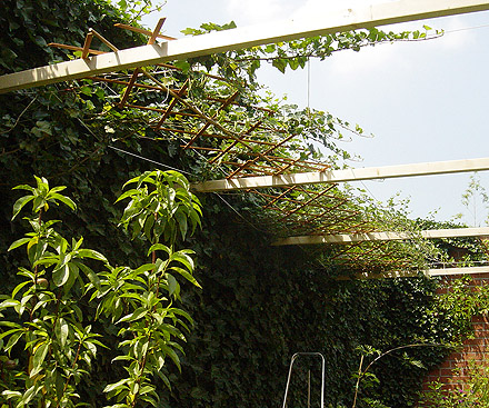 excepto para reparar la pérgola proletaria que solo duro unos meses y cayo victima una de esas tormentas de verano que hay aca en pleno invierno. La misma fue reemplazada por una estructura de caña paraguaya (aca le baten “bambu”: je!) y hasta ahora funciono para sostener una de las dos plantas que habia en los extremos del arco-pergola (a la derecha de su pantaya señora)